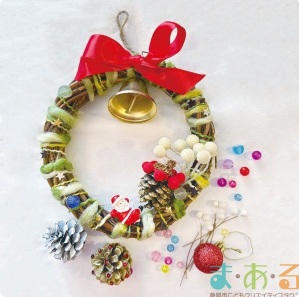 低温グルーガンを使って、木のリースに松ぼっくりやビーズ、可愛いオーナメントなどを自由につけて飾ります。